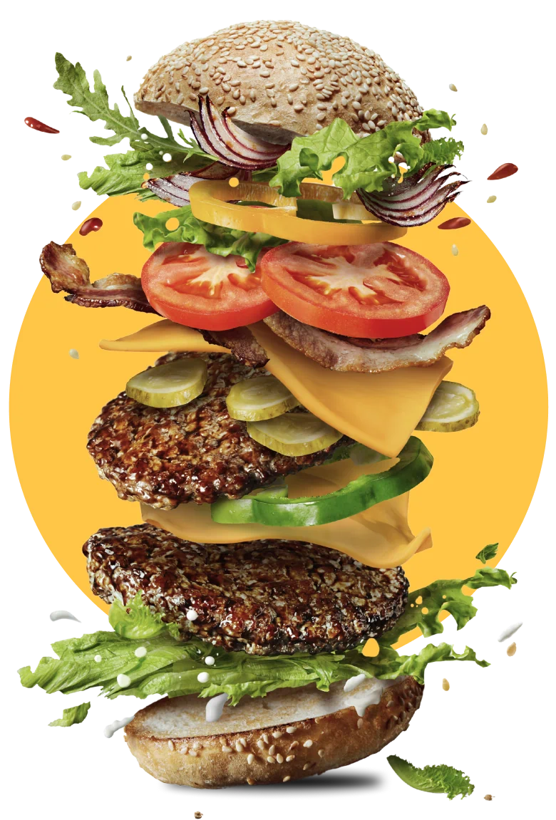 Doble carne de Res, Queso Amarillo, Lechuga, Jitomate, Cebolla, Pepinillos, Aderezo de la Casa